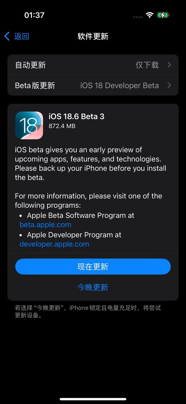 iOS 18.6 的正式版本预计将在 7 月底或 8 月初发布。对于 iOS 18 系统的用户来说,这次更新主要是为了维持系统稳定性和安全性,正式版推送后可以考虑保持更新。